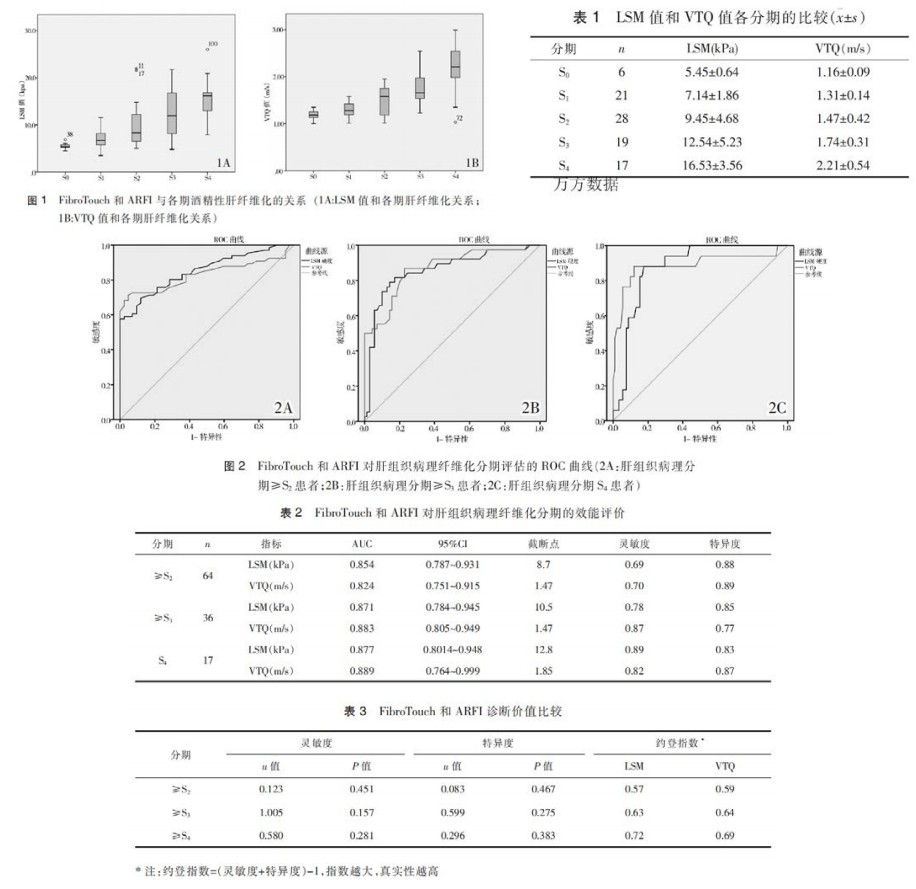 •探讨 FibroTouch 和 ARFI 与各期酒精性肝纤维化的关系,利用 ROC 曲线分析两种检测方法对酒精性肝纤维化程度的诊断价值。