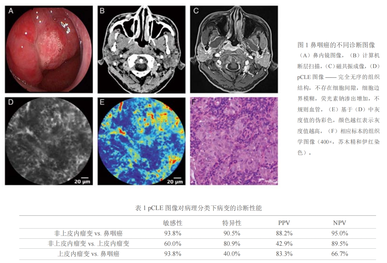 •pCLE 诊断鼻咽癌与非上皮内瘤变的病变的总体敏感性、特异性、PPV 和 NPV 分别为 93.8%、90.5%、88.2% 和95.0%。